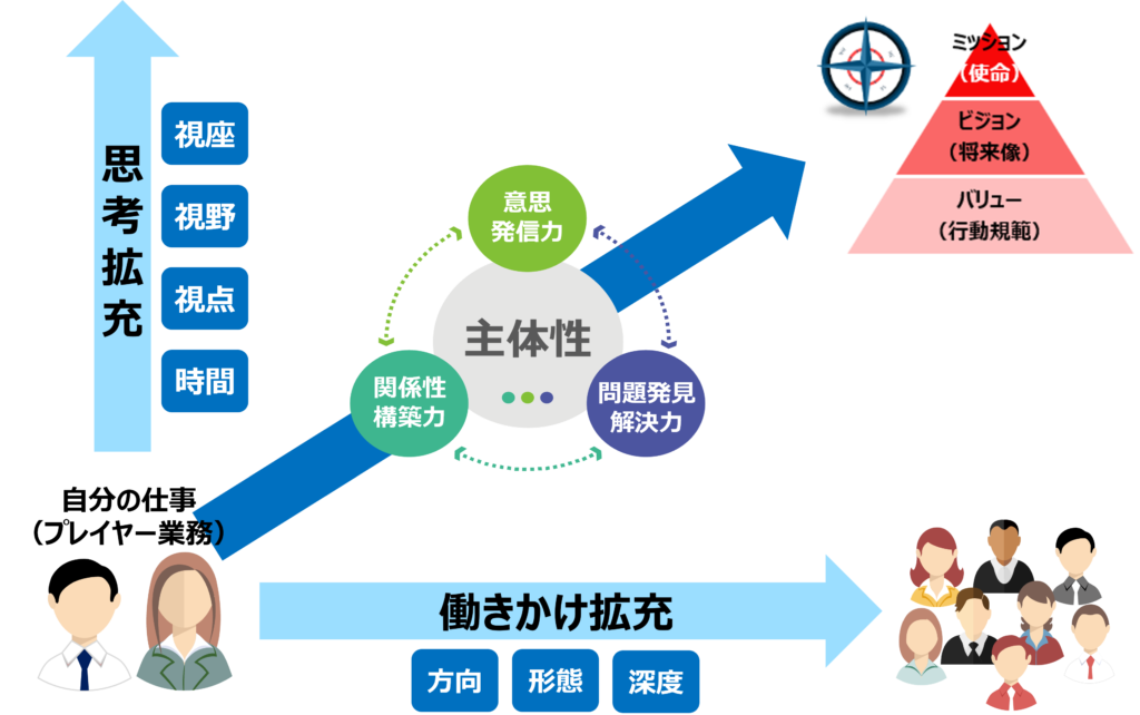 具体的には、自分のプレイヤーとしての仕事のほかに、現場に戻っても「思考の拡充」「働きかけの拡充」を行っていく仕掛けを作ります。