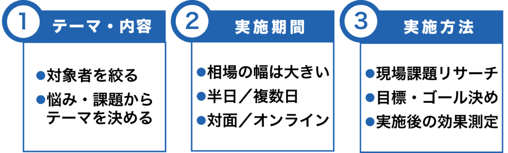 上記それぞれを明確にして関係者全員で共有しておくと、研修の心構えや効果測定の指標にもつながります。