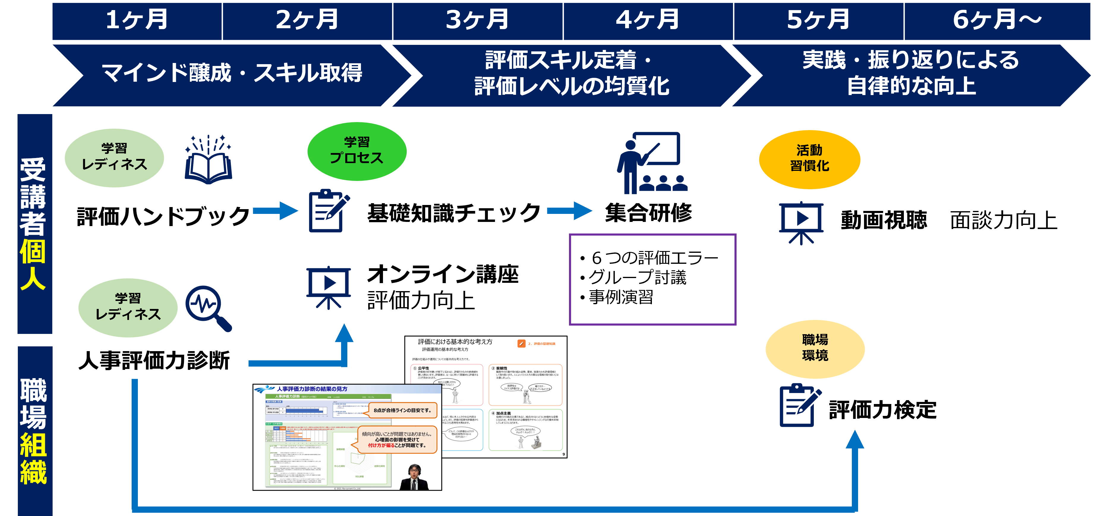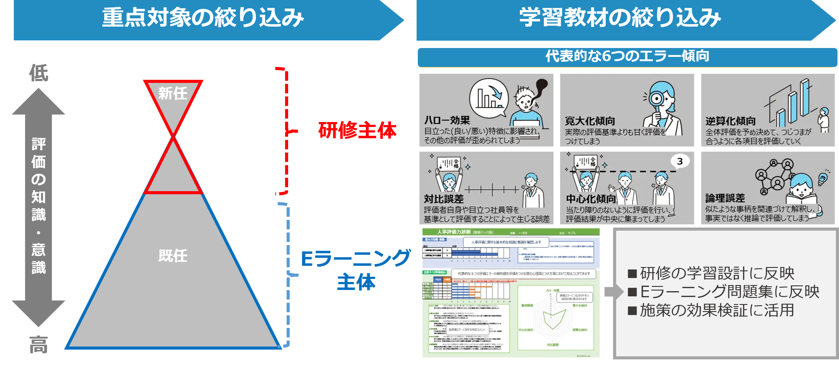 本プログラムでは人事評価力診断をもととして、「必要な人」に「納得した状態」で「負担の少ない学習」を提供できる仕組みを取り入れています。