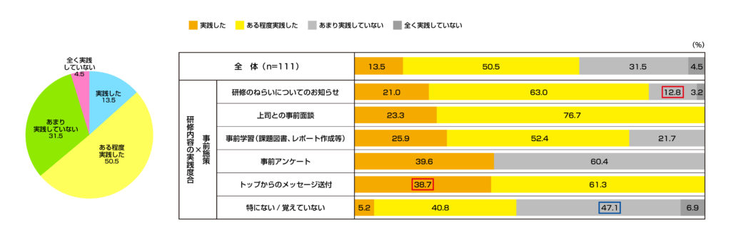 逆に、事前施策について「特にない・覚えていない」とした受講者は、「実践した」が明らかに低く、「あまり実践していない」とする回答比率が高い。