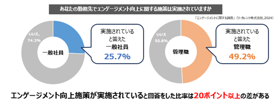 実際に、エンゲージメント向上施策の実施率を役職別に見てみると、管理職は約半数が「実施されている」と回答したのに対して一般社員は25%ほど。