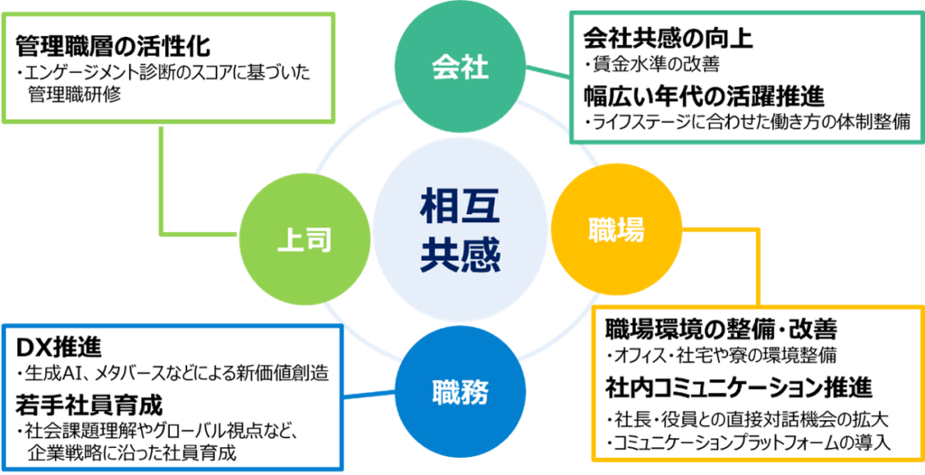人的資本経営に向けた取組みの1軸として経営戦略とも紐づけられながら、日本旅行ではエンゲージメント診断の結果を参考に、会社・職場・上司・職務の4領域でエンゲージメント向上施策をデザインしました。