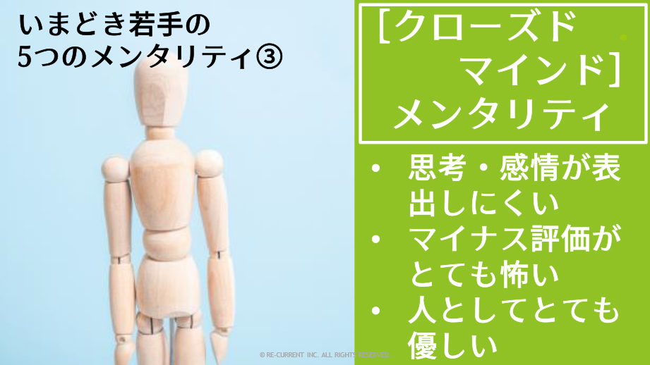 そして、3つ目は「クローズドマインド」メンタリティです。これはオープンマインドの反対で造語としてつけているのですが、周り、特に先輩、上司など、違う世代から見ると思考とか感情が表に出にくいので、何を考えているのか分からないということが起きます。彼らの立場からすると、自分自身の思考・感情を表現する、もしくは態度に出すという習慣がないんですね。みなさん、よく研修なんかで前に立たれると、分かったのか分かっていないのか、反応が分からないということをお聞きするんですけれども、特に集団になるとその傾向は強く出るようです。
