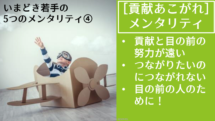 よく最近お聞きするのは、先輩社員と一緒に仕事をしていて、先輩社員がちょっと失敗してしまった、失注してしまった、ミスをしてしまったというときに「申しわけない」という言葉を結構若手の方は使います。それぐらい、自分を守ってくれる、大事にしてくれる、一緒に成長したいという手をつないでくれた先輩、上司、目の前の人のために頑張るというエネルギーはものすごく強い。これはすごいなというふうに感じます。これが「貢献憧れ」メンタリティです。