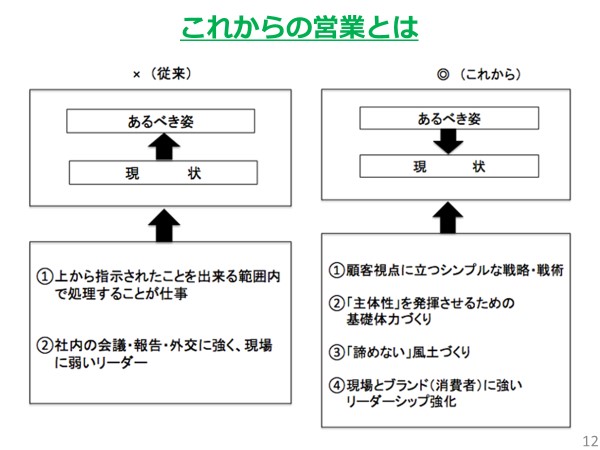 たとえば、飲み屋さんの営業でいうと、カバレッジという物差しがありました。何%の飲み屋さんにキリンが置かれているのか。当時は45%でした。この45の数字を46とか1上げるということではなくて、100しかないんです。100%にしないと、高知のお客さんは、「全国はアサヒビールだけど、高知はキリンビールが一番いい」と思ってくれない。100%にしないといけない。それが「あるべき状態」=「使命」なんです。