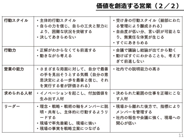 そこで、3つの方針をつくりました。ひとつはやっぱり基礎体力づくりです。企業間の競争力の格差は、大部分は実行力の格差、とくに現場の実行力の格差によるものです。この実行力をつける。さきほど申し上げたような基礎トレーニングを徹底し、それによって応用問題が解けるようにして、営業の自由度を高めていく。