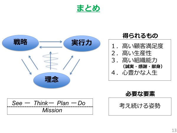戦略と理念との関係もそうです。正しい戦略になればなるほどお客様は喜んでくださる。理念が強化されるのです。理念が強化されるとなぜ戦略がよくなるのかというと、途中で諦めなくなるからなのですね。戦略をつくるのが一番難しい。戦略をつくっている途中で「この程度でいい」となってしまう。しかし、理念が強化されれば、考え続けることができる。理念をスパイラルで上げていくためには、考え続ける姿勢が必要なのです。