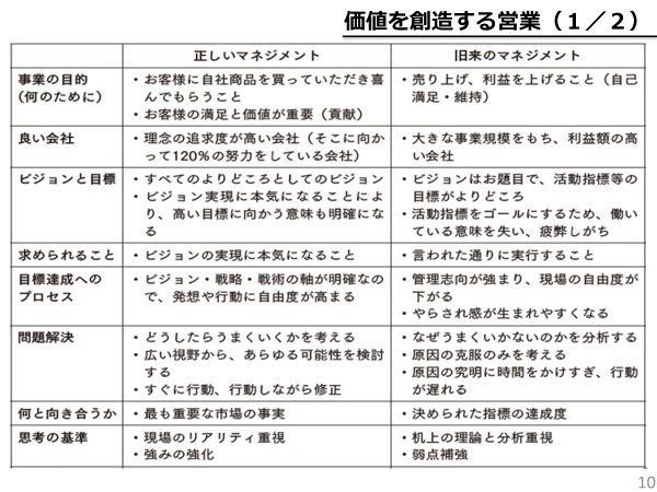 「これからの営業とは」の図の左にあるものが、従来型の一般的なマネジメントの方法です。目標は実現可能性がないといけませんから、前年比101%とか102%とかで行う。上から指示されたことを、自分のできる範囲内で処理することが従来の仕事だったんです。