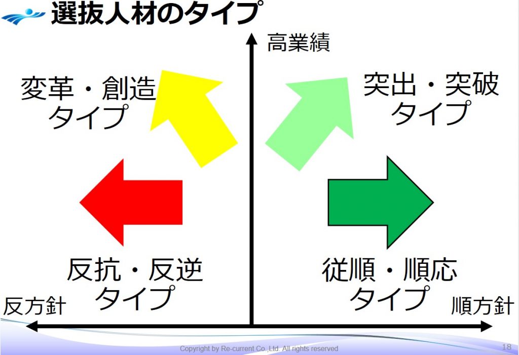 ここで、選抜人材のタイプということで大きく4つ出させていただいております。上が好業績。右側に順方針、こちらに反方針と出ておりますが、順方針のほうは方針に則って非常に高い業績を上げる突出・突破タイプ。この人たちは放っといてもどんどん突き抜けてまいりますのでよいのですが、問題はこちらの従順・順応タイプです。結構、上位で、しっかりと方針に基づいて、上司の意向に基づいて仕事をしてきたというお利口さんタイプでしょうね。じつは、このタイプが意外と化けにくいというのがだんだん分かってまいりました。