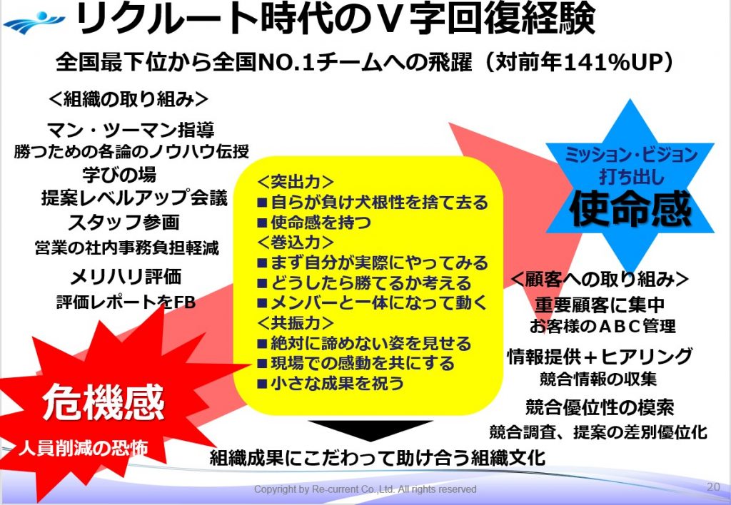 さて、いままでのような考え方は、私が新卒時代の出身であったリクルートで体験したことをベースにしております。金融不況時代、1998年でございますけども、マネジャー5人のメンバーを率いて金融不況時代にまったく業績が上がらないところを、このミッションによる使命の自覚ということを自分自身で行って、V字回復を本当に経験したという私の体験からも重要ではないかということで実践させていただいております。