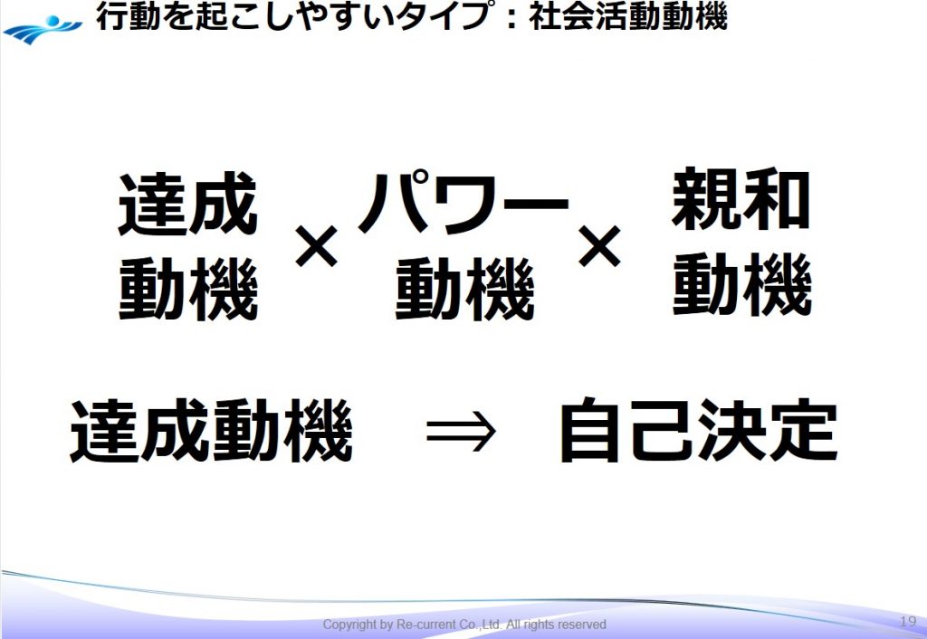 いずれも、行動を起こしやすいタイプというものが、人間が持っている3つの社会活動動機のなかから特定できております。