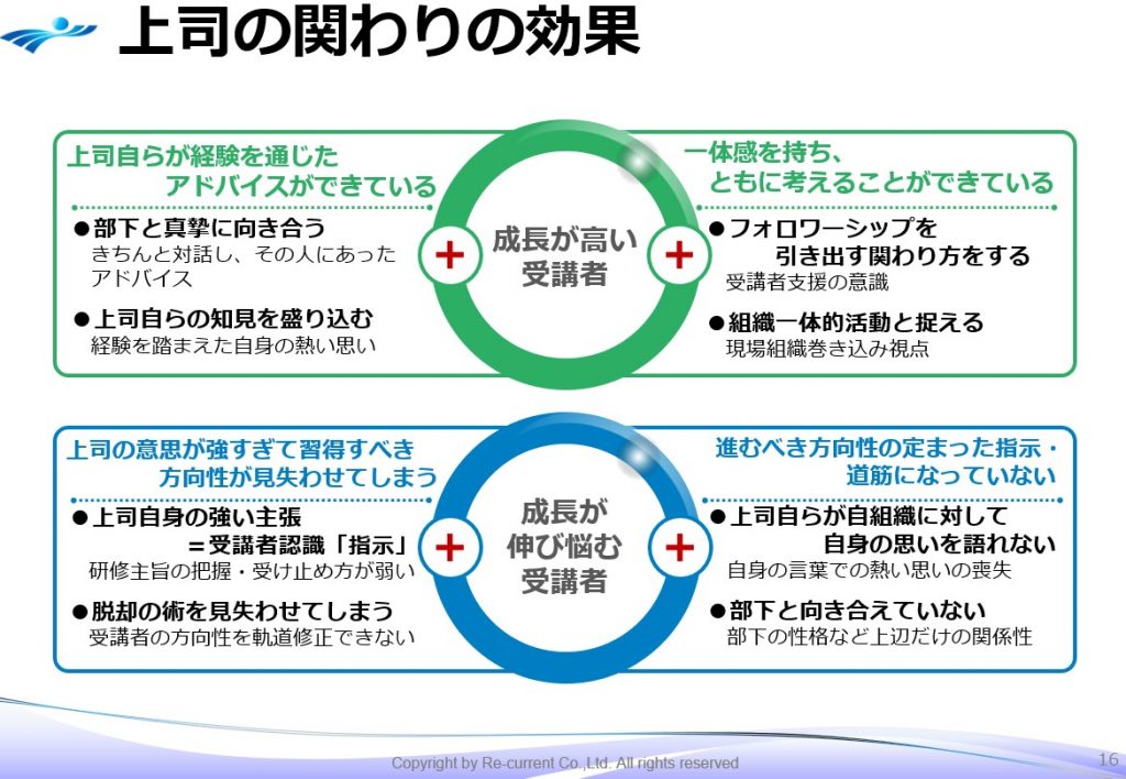 上司の関わりの効果は、分析しましたところ、成長が高い受講者はやはり上司が有能です。成長が伸び悩んでいる受講者、これはもともとポテンシャルが低い層です。彼らには、上司自身の関わりが弱い、もしくは上司の人材育成能力というのが発揮できていない、もしくは上司の人材育成能力が低いという共通点が出ておりました。上司というのは非常に重要なのだという検証ができております。