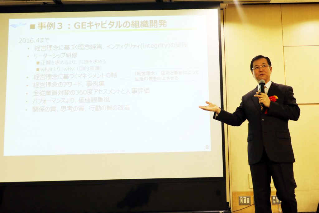 3つ目に鬼本講師が挙げたのは、講師自身がかつて在籍していたGEの金融部門、GEキャピタル(2016年4月に売却)の事例です。同社では「技術と革新によって生活の質を向上させる」という経営理念に基づくマネジメント。いわゆる「理念経営」が実践されていました。