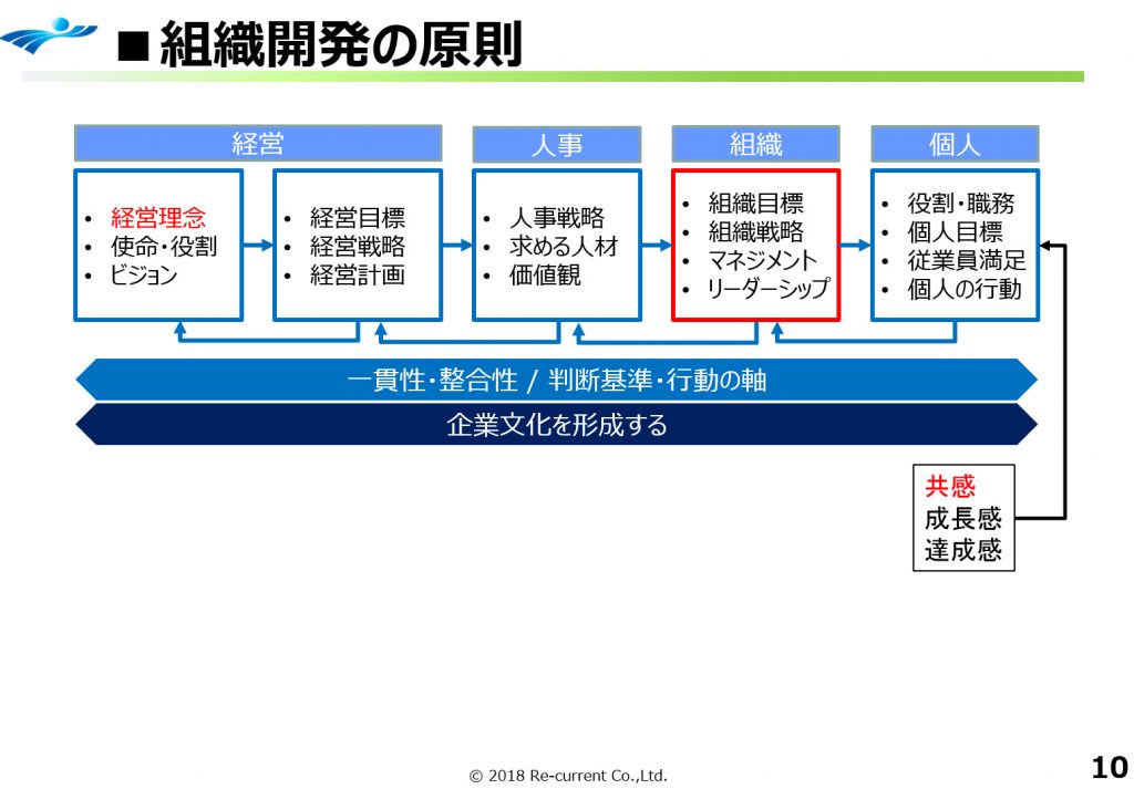 「組織開発の原則」とは、まず何よりも「経営理念」を起点とすること。そして、その理念を経営目標・戦略・計画に紐づけた上で、それを「誰がどのようにして実行するか」、すなわち具体的な人事戦略(採用、登用、育成、配置)やマネジメント手法へと落とし込み、社員一人ひとりの達成感・成長感にまで結びつけていかなければなりません。経営理念を判断基準や行動の軸に据えることで、こうした一連のプロセスに一貫性、整合性が付与され、企業文化が育まれていくのです。