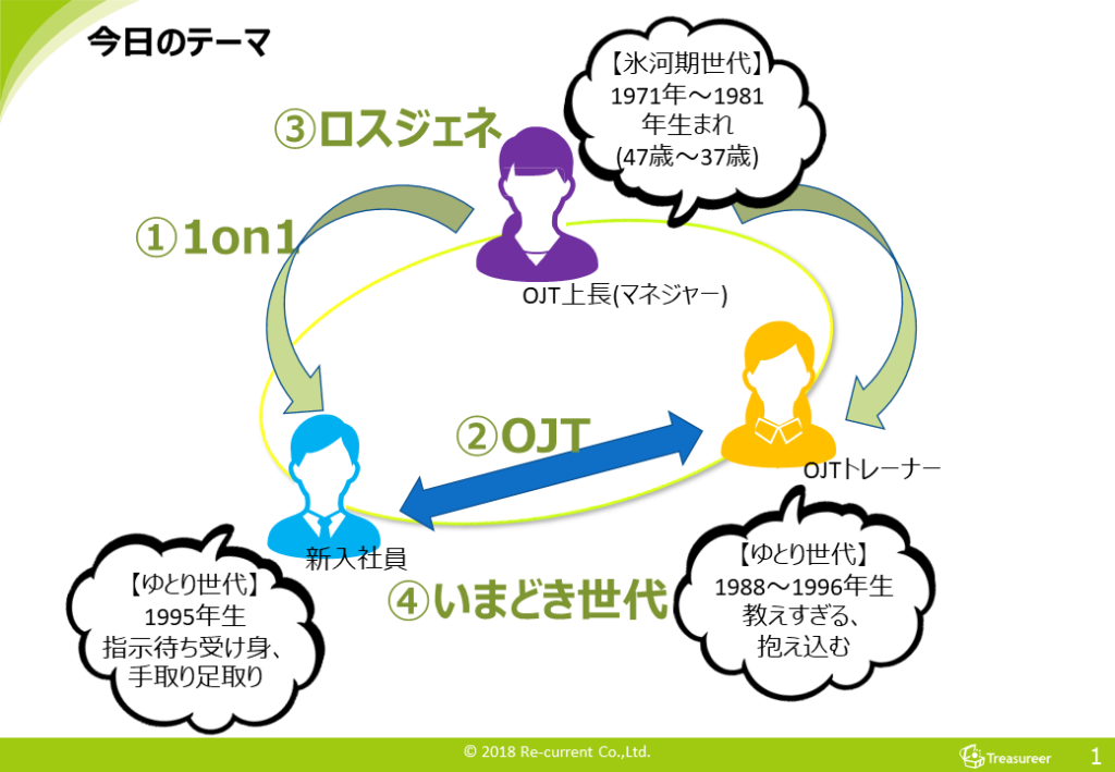 「1on1」そして「OJT」「ロスジェネ」「いまどき世代」――セミナーはまず、これらの要素から成るテーマの全体イメージ(下図)を確認・共有するところから始まりました。