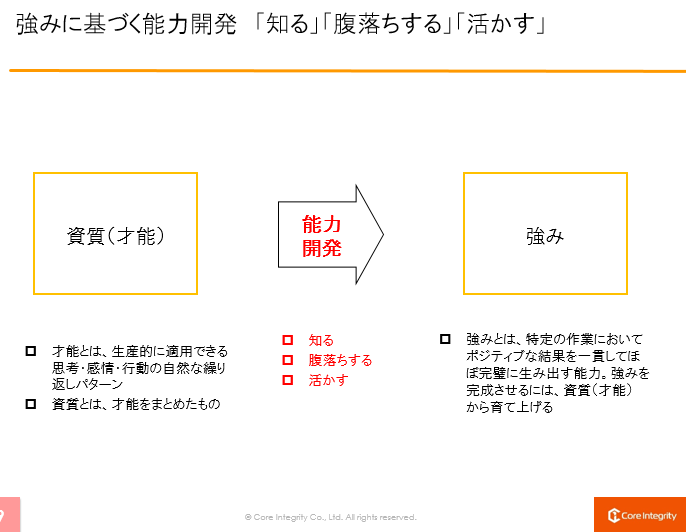 ストレスファインダーで診断された上位5つの資質を強みとして完成させるためには、➀「知る」➁「肚落ちする」➂「活かす」の3ステップからなる能力開発が有効です。