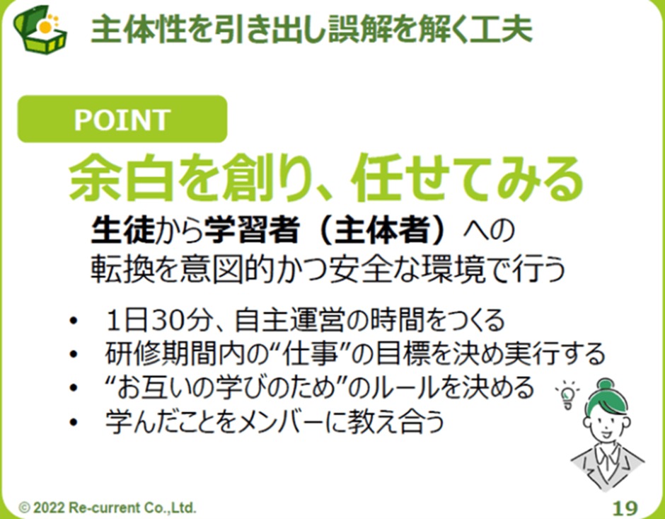 しかし、そういった余白のなさが、新入社員たちを「学習者(主体者)」ではなく「生徒」にしてしまっているかもしれません。