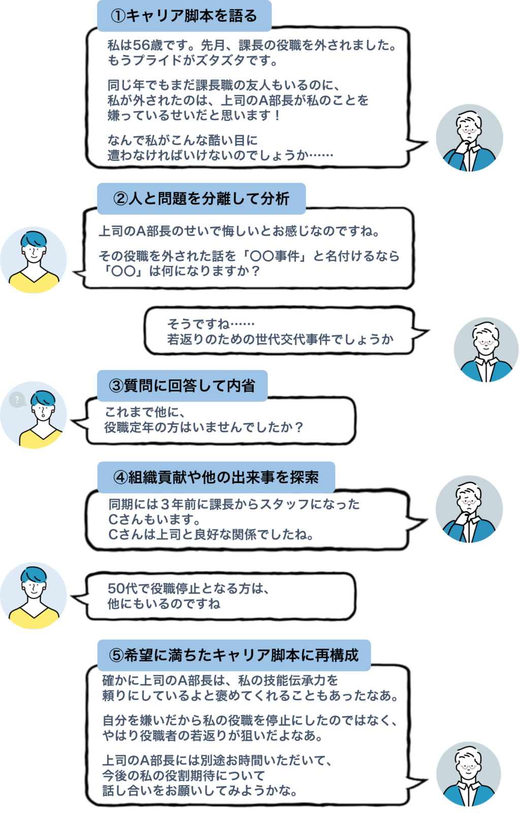では、ナラティブ・アプローチでは、具体的にどのようにしてキャリアの捉え直しを行うのでしょうか。