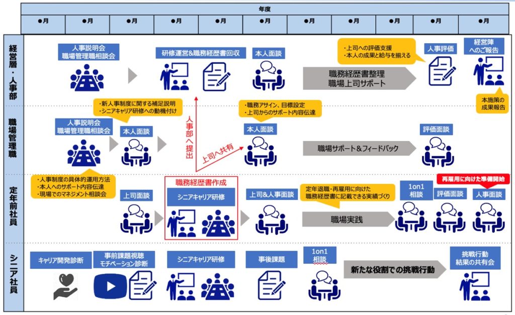 リ・カレントのシニアキャリア施策では、単なる研修だけではなく、継続的なサポートを提供しています。