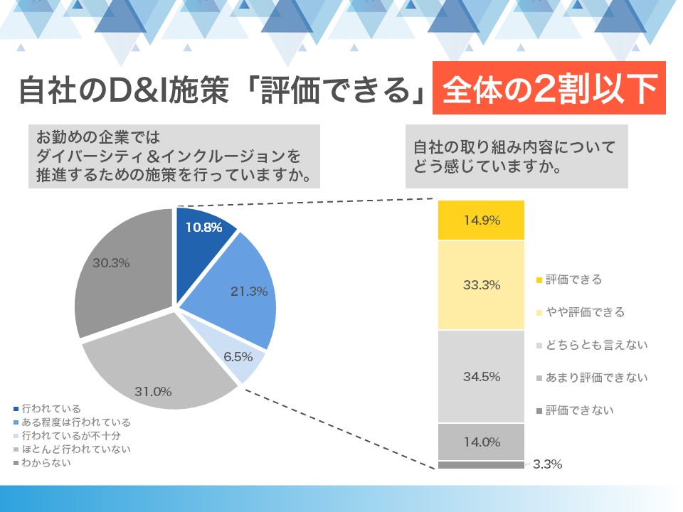 取組みが一定以上の評価を受けていても実際の職場変化となると反応が鈍る、という課題は、人それぞれの価値観や課題意識の影響が強いD&I推進にとっては、避けては通れないものとも言えるでしょう。