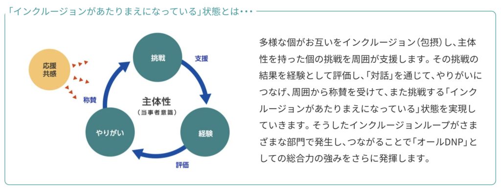また、D&I推進についての中期ビジョンとして「インクルージョンが当たり前になっている状態」を掲げており、DNPグループに昔から根付いた「挑戦する」という文化をより奨励する形でインクルージョンが実現されるよう目指しています。
