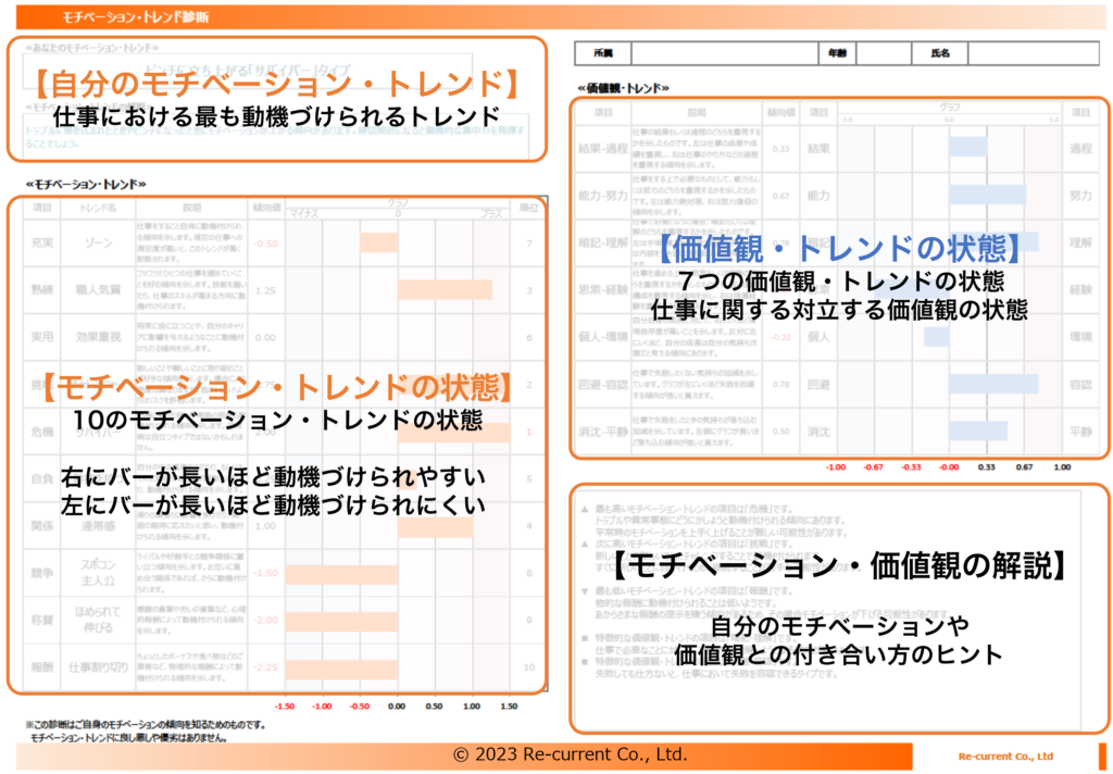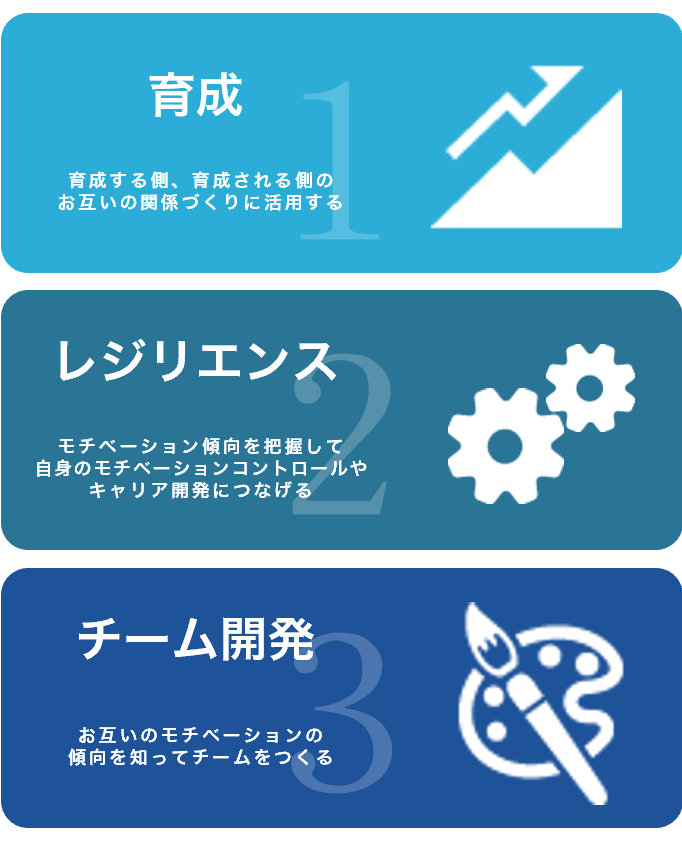 仕事において重視する価値観や思考傾向を可視化し、自分と周囲が動機づけられる声掛けや関わりを理解することにつながります。
