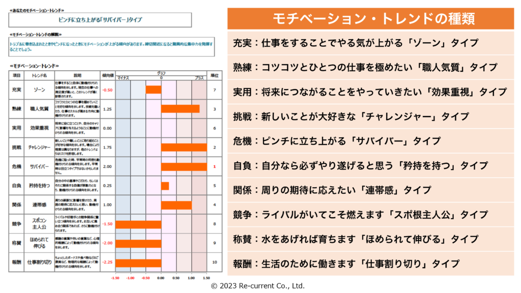 10種類のモチベーション・トレンドごとに、本人がそのトレンドに動機づけられやすいかどうかの状態が示されます。